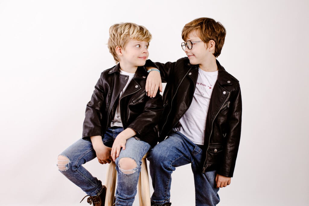 Elige ropa que refleje quiénes son tus hijos. Puedes combinar estilos diferentes para resaltar sus personalidades: uno más tranquilo y elegante, otro más enérgico y creativo. Evita prendas incómodas o que restrinjan sus movimientos, y opta por colores que armonicen con el fondo del estudio sin perder su esencia.